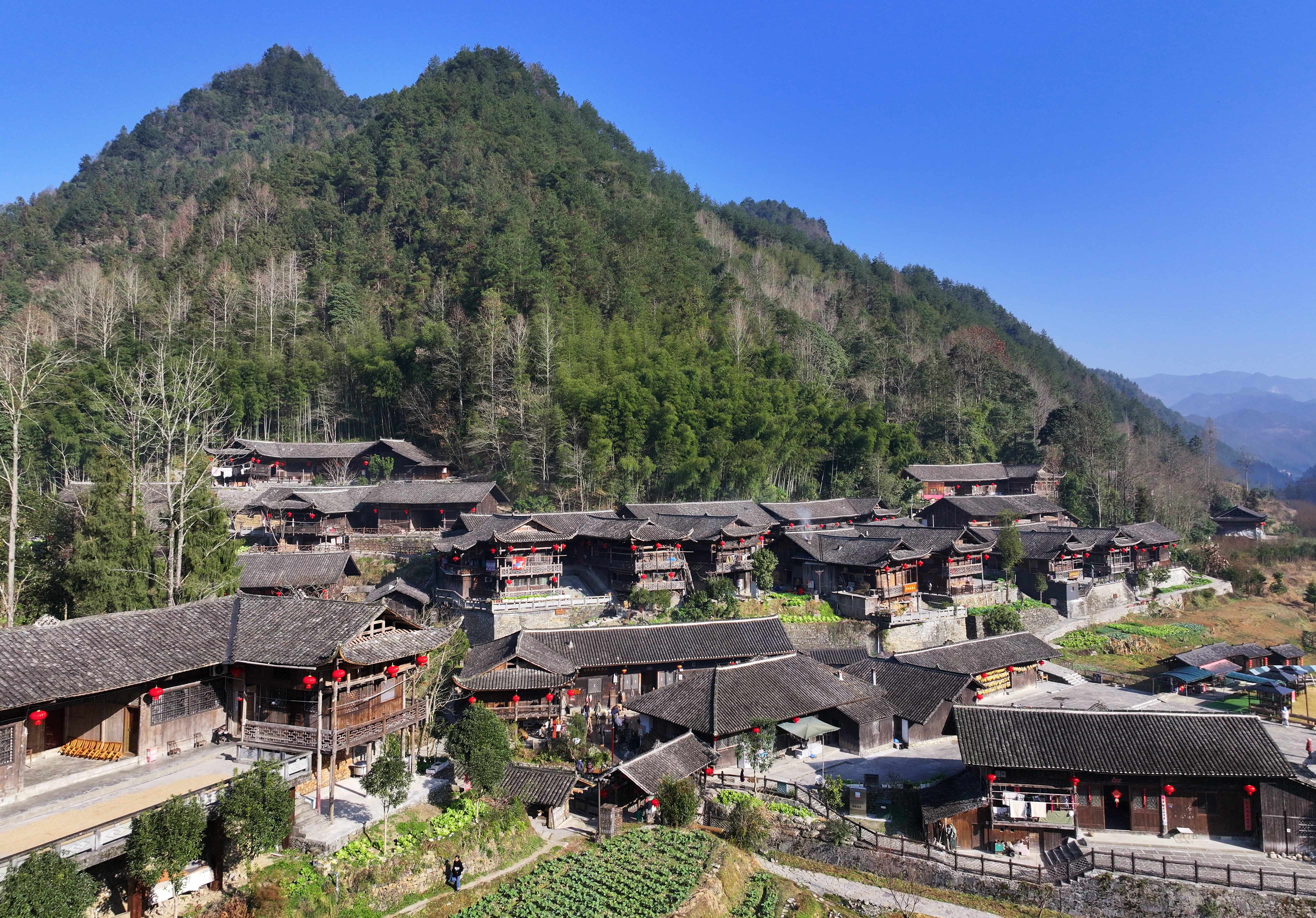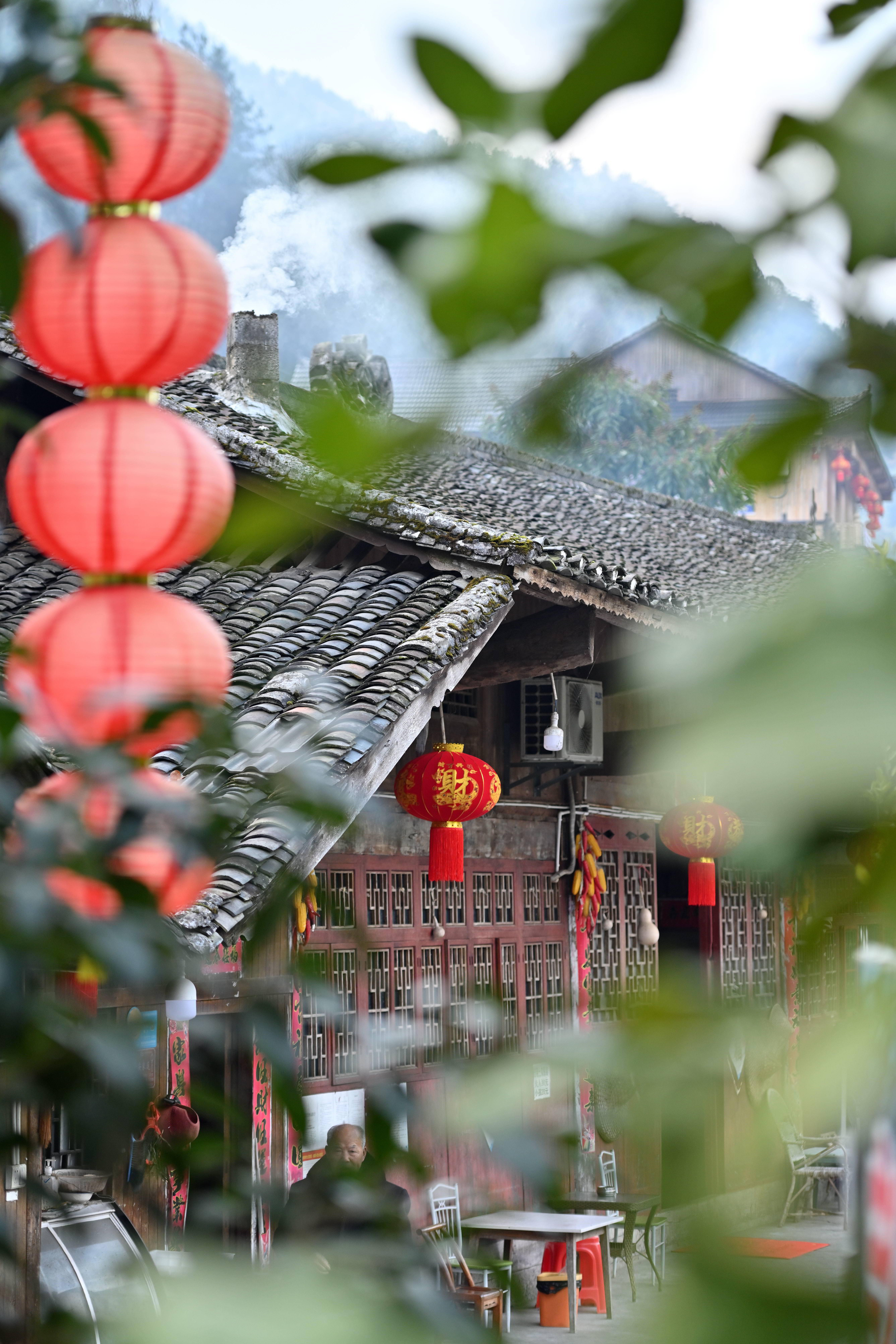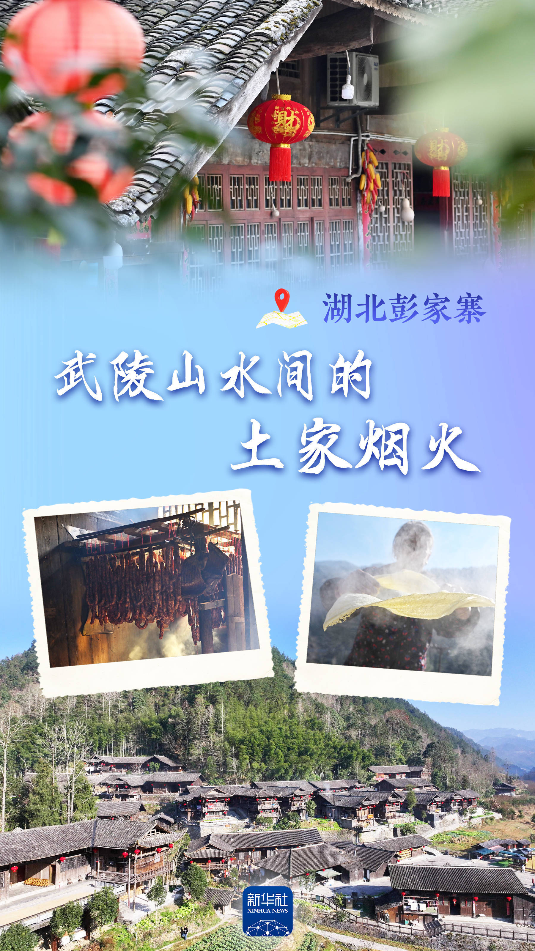 彭家寨吊脚楼挂上红灯笼。新华社发(陈绪开 摄)屋檐飞翘,大红灯笼点缀其间,屋内飘出烟熏的香味。记者顺着“烟气”来到农户彭继全的家中,火坑里正烧着柴火,上方挂着熏得红里透亮的猪头、猪腿、猪排等。