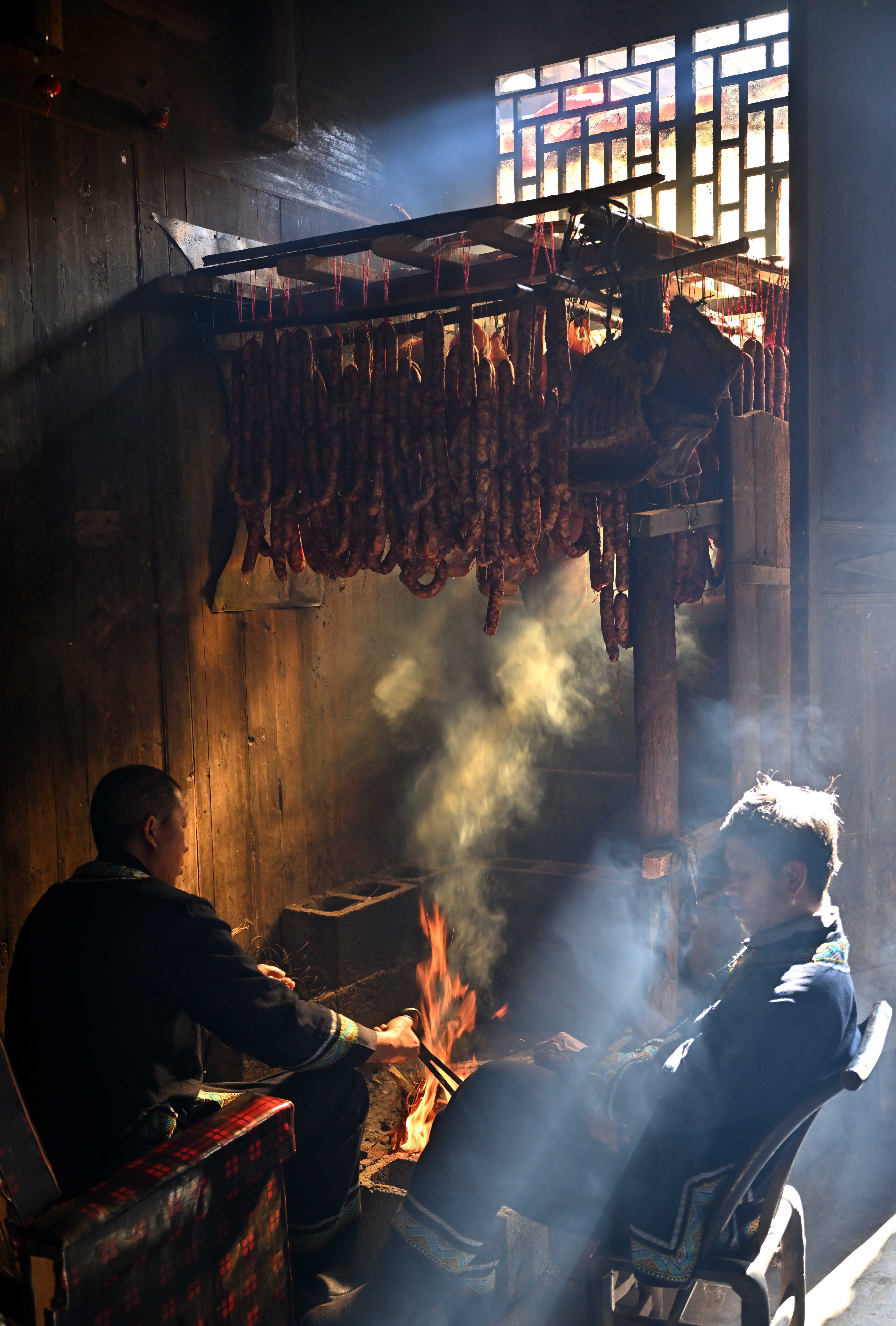 村民正在取祥和熏腊肉。新华社发(陈绪开 摄)“烟气等于古寨的命根子。”荀杰说,山中杂木毁掉及作念饭时形成的烟气,粗略烘干屋中的水汽,烟里的焦油、酚类物资渗进木料,会形成一层保护层,起到加固木质、防潮防虫的作用。