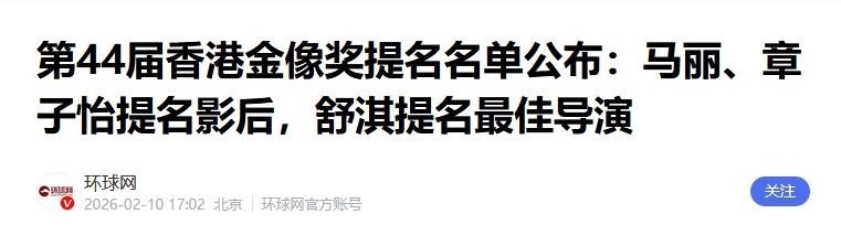 2月10日,第44届香港电影金像奖公布提名名单,马丽、陈法拉与章子怡等五位女演员共同入围最好女主角。